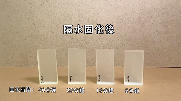 這次實驗以 Phrozen透明樹脂 做同厚、同長尺寸的長方體模型,在隔水固化以30分鐘、20分鐘、10分鐘、5分鐘為實驗變數,